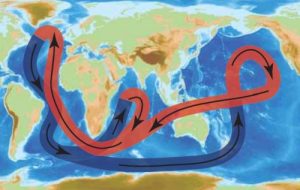 深層大循環は、難しくいうと「熱塩循環」とも呼ばれる水の環(わ)です。この循環を引き起こすエンジンは海水の重さです。南極や北極付近の表層の海水は、大気から強く冷やされるために重くなって沈んでいき、それまでに深層にあった海水を押しのけながら全海洋の深層を巡って、再び深層水は表層水と混じり合いながら上昇して暖かい表層水になります。そしてみたび、深層水のできるグリーンランド沖に戻っていくベルトコンベヤーのように廻る大きな流れになります。