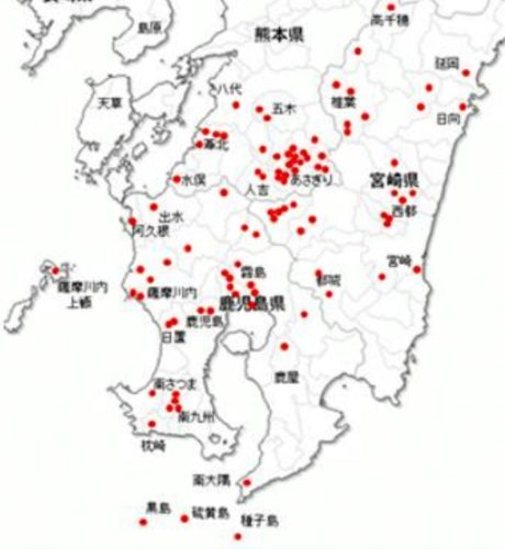 図9. 九州南部の臼太鼓踊り分布〔後掲ヨケマン〕