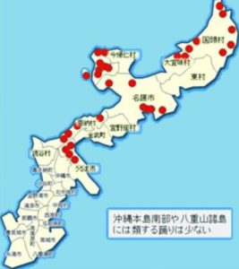 図9は九州南部における臼太鼓踊りの分布であり、人吉球磨盆地は密である。図にはないが奄美大島には「ほうらしゃ六調太鼓」という踊りがある。図10は沖縄本島北部の「臼太鼓」の分布で、音楽学の小林 公江氏の「沖縄本島北部の臼太鼓」をもとに筆者が作図したものである。やはり「臼太鼓踊り」は南からやってきていたようである。このような踊りだけでなく、後述する「牛深ハイヤ節」や「球磨の六調子」なども、これら南方の地を経由して球磨地方に伝わってきたと考えられる。〔後掲ヨケマン〕