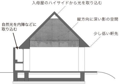 また、軒を2・2㍍と抑えたことで祈願所の高さを強調。屋根の高窓からは自然光を取り込み、祈願所全体に影と光のコントラストを生み出した。