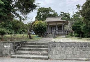 本殿右手に、本殿とは逆に東の海を拝ませる向きの石と壇がある。やはり台風でかしいだらしき花瓶を、一応立て直して、拝む。