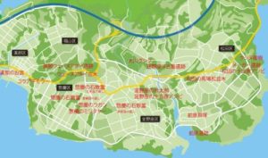 問題はその中心地ですが、水平的な集落展開が基本ながら、概ね宜野座村域から漢那への重心移動が想像されます。なお、「宜野座」というのはここへ派遣された「島横目」職の役人姓だったそうで、逆に言えば、それまでは「史書に特記すべき何者も居なかった」という感覚で捉えられた土地だったのでしょう。