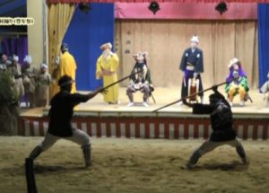 真喜屋のアシャギ庭[ミャー]には、村踊りを演じる常設の立派な舞台がある。