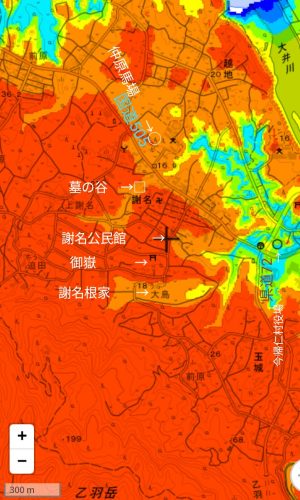 +∶謝名公民館〔地理院地図/自分で作る色別標高図〕