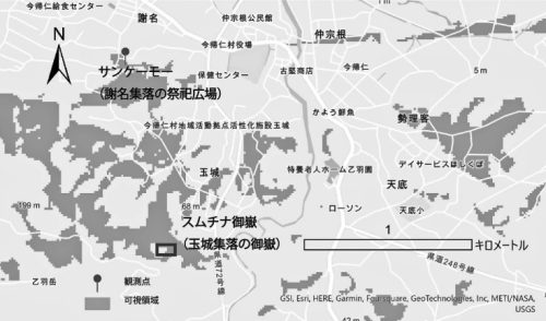 なお、楊さんは実直に、謝名の拝みの対象となる玉城スムチナが、視野として実際に謝名サンケーモーから見えたのか、という証明をしています。見えたことが確認されています。