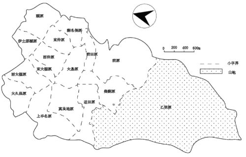謝名は,東仲原,西仲原,頭原,伊地那覇原,大島原,東大棚原,謝名俣原,前田原,西大棚原,上手名原,大久保原,真良原,迫田原,美謝原,前原,乙羽原の 16 小字から構成される(図3)。乙羽岳を主峰とした山並みを抱く乙羽原が約半分弱の面積を占めている。大島原は古い集落である。田という字が付いている地名はかつての水田を示しており,小字名からは昔の地形の特徴と土地利用を確認することができる。