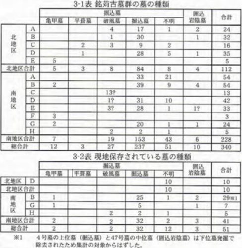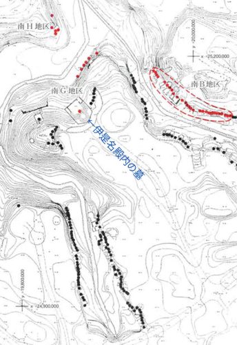 同古暮群は、大きく南地区と北地区に分けられ、さらに、それぞれの地区においてA地区~G地区(南地区)、 A地区~E地区(北地区)に細区分して調査が進められた。(略)〔後掲那覇市教育委員会2007 16-17枚目p6-7〕