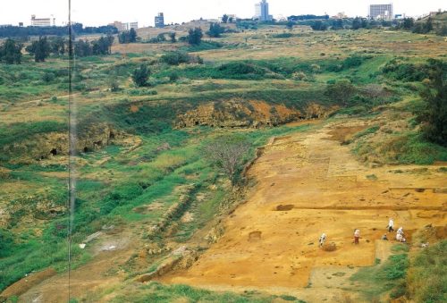 (続) 那覇市では,この広大な地域を市の新都心として開発するために「那覇新都心土地区画整理事業」を計画しました。一方,市教育委員会では同事業に先立ち,文化財課による埋蔵文化財の分布及び試掘調査を実施し,その結果を踏まえ1990(平成2)年から1999(平成11)年まで,10年間の長期に亘る本格的な発掘調査が実施されました。発掘調査の結果16ケ所の遺跡が天久地域から発見され,その中の一つが「銘苅古墓群」と呼ばれる遺跡です。