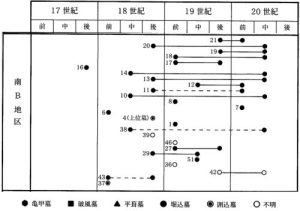 亀甲墓の各地域への意匠的伝播は様々な要因が関わっており、地域差は大きく、またそれが系統だって伝わっていないようである。この点が興味尽きないところである。名嘉間宜勝氏によれば、伊平屋村字野南、与那城村字伊計、 勝連町字平安名、南風原?津堅、中城村字津波?伊集、糸満市兼城、喜屋武、石川市川平で亀甲嘉が支配的で、分布の北限は伊平屋島であり、与論島北部にはないという報告がある。平敷令治氏の首里平良町・大名町・末吉町の墓の分布調査(1985?86年) の調査報告がある(11-2表)。末吉はもと西原間切に属し、1920年に首里に編入されたムラであったが、上ぬ山周辺の110基のうち、亀甲墓は32基にすぎない。近代以降、伊平屋村・伊是名村等特定の地域で、亀甲喜を造ることが流行したのだろうと述べている。近代以降の農村の亀甲墓も概ねウーシ・袖石の備わった範型であり、近世末期の「百姓の亀甲墓」は非常に少ない。また地域によっては亀甲暮の急速な普及にともなって、ヤジョーマーイが欠け亀甲の盛り上がりが詩張された変型(宜野湾のボージャー墓) 亀甲のマユに近い部分だけを造り亀甲の過半を意図的に省略した変型(西原町と中城村に多く分布しているクサチリ墓)があるなど、 亀甲墓意匠の伝播の多様さをわせる報告である。〔後掲那覇市教育委員会2007/第11章 1-3意匠の伝播と継承 140-141枚目、p132-133〕