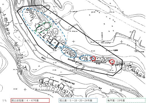 47号墓では、囲込岩陰墓の①・②と掘込墓の②が重層で確認された。これらを古い順に下位墓、中位墓、上位墓と仮称する。なお、4号墓では下位墓と上位墓が重層で確認された。(略)