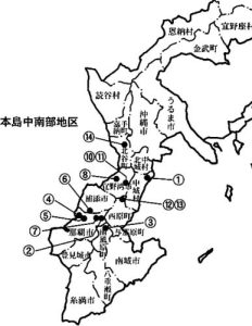 次の図は、造墓年代の分かり、かつ草創期又は大規模の14亀甲墓の所在地を示したものです。