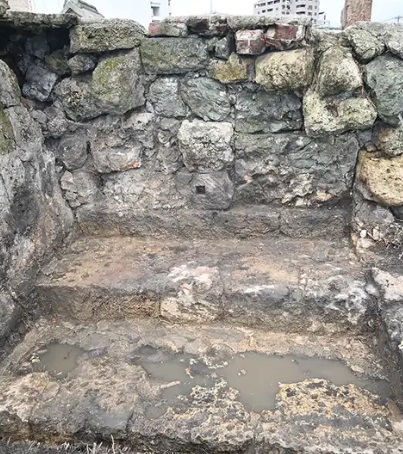 三重城の南西側で新たに見つかった階段=2025年12月11日〔後掲琉球新報〕