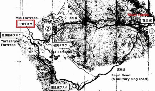 イオ(硫黄)要塞は港の近くにありますがさらに奥に位置し、主な兵器庫として機能し、防御位置に集まる火気兵たちに武器を配布しました。トミ要塞(豊見城)は港の奥深くにあり、指揮統制の中心でした。パールロード(真珠道)は軍事目的で明確に建設され、これらの要塞同士および首里城とを結んでいました。