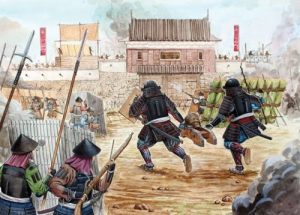 5月4日、島津は首里の赤い宮殿の城壁に向けて丘を登り、城壁に砲火を降らせるためだけに一時停止した。日本のハルケブッサーが守備隊の頭を下げて守り続ける一方で、足軽ははしごを登らせた。侍たちはすぐに城壁を越え、首里の下のベイリーを次々と奪取した。