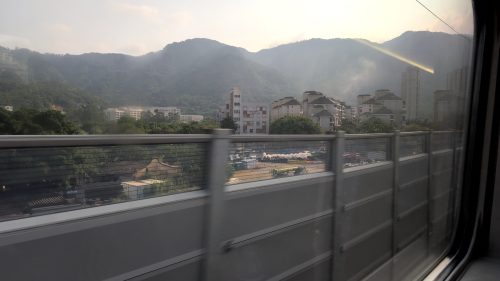 中州向こうの川を渡った。次は福清西とアナウンス。ちらちらと凄い集落が見え始めました。──そうか、明日、泉州への途中で下車する方法もあったか?荷物預かりがやや不安だけど……。