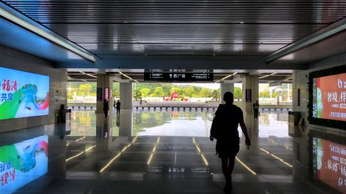 福州南前に大団地。地下2階が線路ほか交通路、3階の高さから伸びる高層ビル。この中州は未来都市になりました。個人的には住みよいと思えないけど。──福州からと同じほどの人数が乗ってきます。
