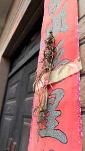 対聯に草をテープで付けてるのは、どうやら風習らしい。確かコレ……広州にも、あったな。1016