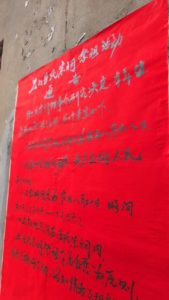 T字路を左折東行。祭祀活動の通告の赤紙。達筆で読めない。王氏宗祠理事会2025.9.15発──って明日だぞ?