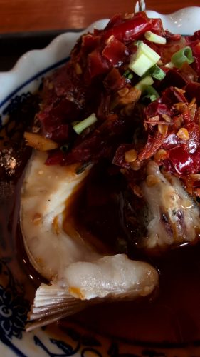 極めつけは鮭らしき魚の切り身を唐辛子まみれにしたもの──だと思ってたら、トマト味でした。トマト味でピリリと唐辛子ならイタリアーノですけど、これは安物中華によくある唐辛子の軽い酢漬けですから、味覚のコアは唐辛子。
