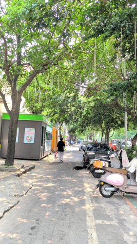 福寿巷へ左折北行。水路で釣りをする人。街路樹はガジュマルだらけ。