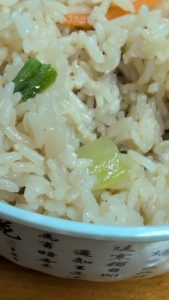 セロリと人参しか見当たらない。おこわ風炊き込みご飯なんだから醤油めいたものが混ざってるはずたけど何の醤なのかは分からない。