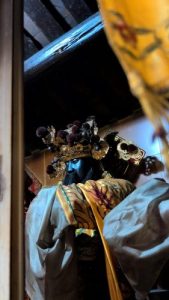 中央本尊は正面からは見えない。右からのぞき込むと蒼じみた木造の青年像。