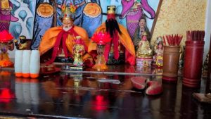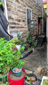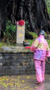 入口ガジュマル下に「樹神」。このカジュアルは対面の家屋に倒れかかってるのを鉄骨で補強してある。