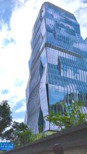 波立ちビルディングの間を抜けて宜蘭路。1002。南が信義国際中心、北が匯金(同)。