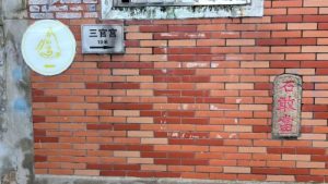 1513靖山路にT字でふつかる。左折、すぐ右折。この右折地点に「三官宮10米→」とあり、右下に石敢當がある。10m、ad.にして靖山路2辺りには何もないし石敢當の文字も新しい。