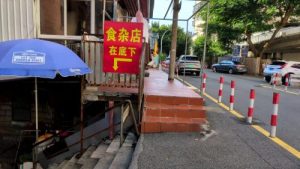前回も覚えのある道。「食雑店在底下↓」と看板。