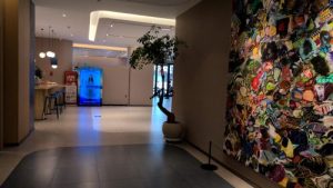 莫泰酒店のこの正面にはAI案内人がクネクネしながら待っています。