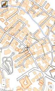 この前にブロック内に入る左折道があったはずだけど(ヒルズハウス大名西対面→GM.)見つかりませんでした。やむを得ん。掲示板向こうに左折北西行、対象ブロックを反時計方向に回り込んでみる。