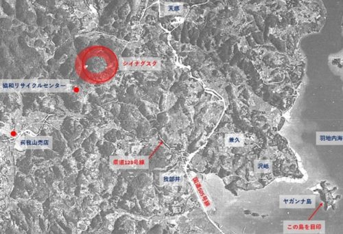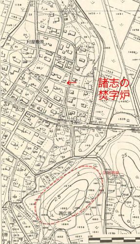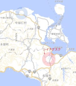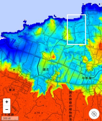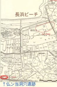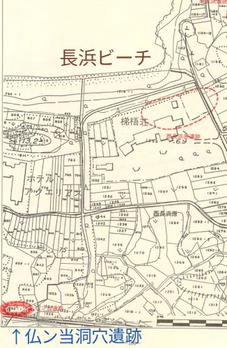うち、最後期に当たるのが仏ン当ですけど……土地勘がないのでどこだか分かりませんでした。今帰仁村1984の遺跡地図によると、ここ。旧・梯梧荘※(≒現・コテージ・シーウィンド今帰仁)の南西、与那嶺-諸志の境線上。つまりこの地点が、先史代の集落地の一つでした。