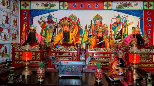 近寄ると……右手南方にも祠?福徳正神と絵に文字。北面。右聯「日照乾坤五鳳祥」左聯「天開美〇三臺瑞」