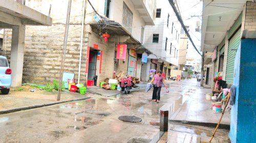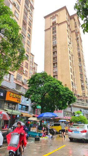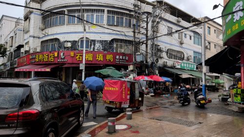 0938朝陽大道を南へ渡る。小さい市場。網から首出し残飯をつつく鶏。