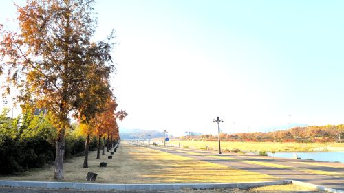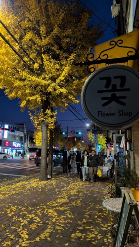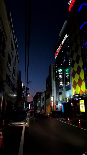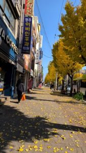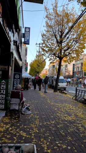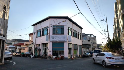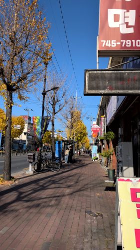 教会を過ぎた85번길20辺りがトップで下り始める。北東角の公園。右折東行。の前に何となく南西角の店を一枚。1527