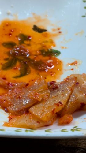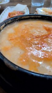 おかずにも一切れ豆腐があったんですけど、もちろん同じモノでしょう。キムチチムに使うような古漬けペチュキムチが同じ皿にあるから一緒に食えということでしょう。これが嘘みたいにマッチします。豆腐の逞しい主食感というのでしょうか、豆豆しさが古漬けの酸味にピタリと来るのです。