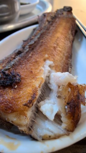 カリカリに焼いた太刀魚。最初のとっかかりが作りにくいけれど、身が取れだすとポロポロとイケます。淡白味にして濃厚な脂。何でか知らないけど日本ではこの形の焼き太刀魚は絶対にない。