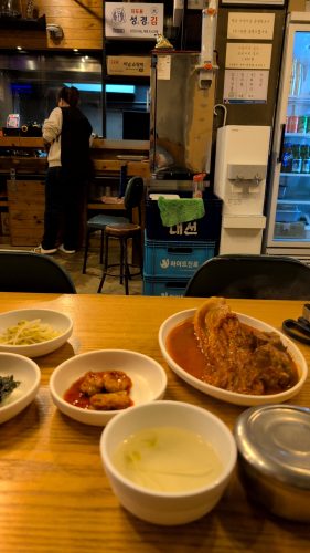 仕込みに忙しいらしく「すみませんお代を払わせて」「何食った?」「カルチです。10千₩です」という調子?