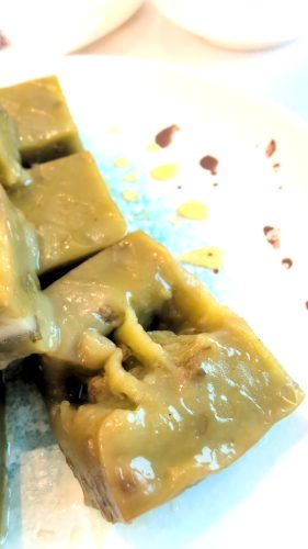 糕。これは純粋に、というのは和菓子感覚で美味かった。緑豆餅であると同時にヨモギ餅で、方形の見かけに関わらず結構粘る。