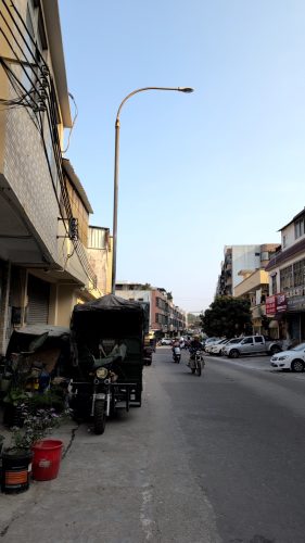 0743福満楼に向かうと丁度朝日の曙光が差しました。