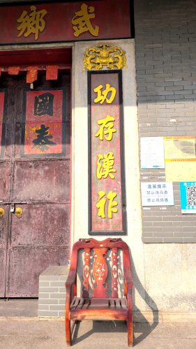 なぜか両側対聯下に椅子。同対聯上にレリーフ。