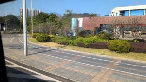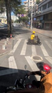 車中。掃除のおばちゃんが紙コップに入れた水を数滴ずつ道に垂らしていく。あとで一気にモップをかける気らしいけど、それは通行人にとっては滑りやすくなるのでは?