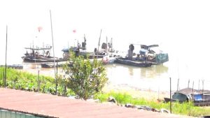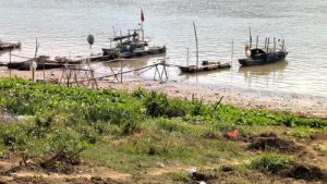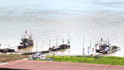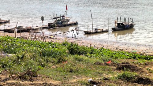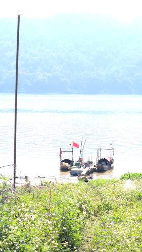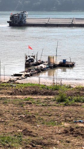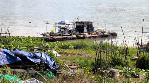 やや高みから「「漁民漁具摆放点」」と岸の家船、西江