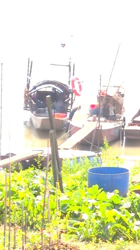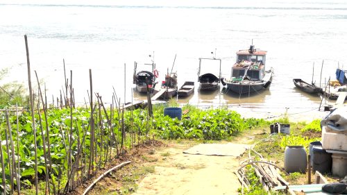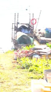 やはり家船群がある。川辺は幸い駐車場として歩ける。東へ。
