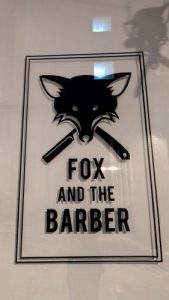 夜道で見つけた「狐と床屋」ロゴ──何となくセンスが良いような訳分からんような。