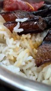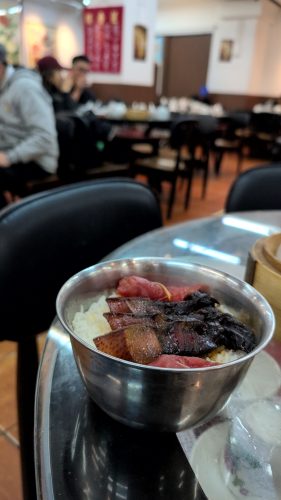 釜飯。腊肉(中華ハム)入りのを見つけることができました。酔うほど白酒が染みてます。脂も強い。サイコロ大を噛み取るとライスが一欠片食えます。ライスはインディカのパサパサに、既に肉汁が程良く染みてる。