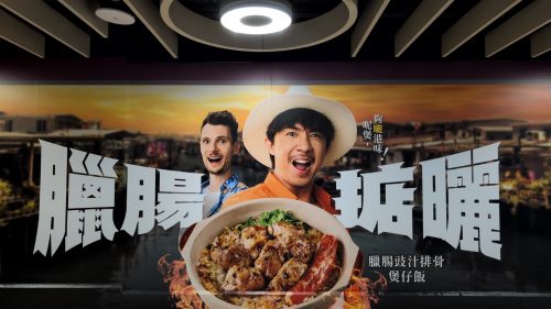 「臘腸掂曬」──「掂曬」は広東独特の語句。中華ハムとホルモンでとにかく濃い丼なので……CFもかくも濃い。