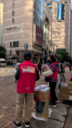 銅鑼湾。香港島には、伝統なのかなぜか新聞売りが多い。