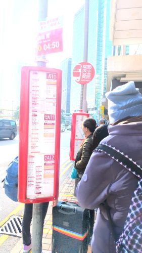 A11からNA11 A17 NA12というのがあるけどどれも机場へは行くらしい。10.5HK$、高德地图だと44分。往港珠澳大橋香港口岸 to Hong Kong Port of HK-Zhuhai-Macao Bridgeと記されてる。──0959。にしては来ないなあバス?